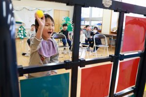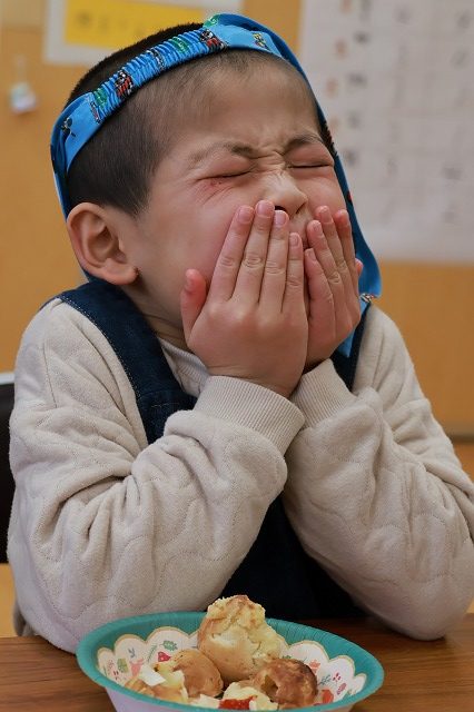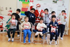 そして、お楽しみ会当日!ボーリングと的当てのゲームを行い、1位を目指して頑張る姿が見られました。ゲームの後は、みんなが楽しみにしていた調理!カステラやピザをみんなで協力して作り、笑顔で食べる姿が見られました。最後には、サンタさんが登場!!きらきらと目を輝かせながらプレゼントをもらい、みんな大喜びでした。