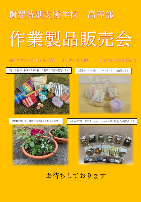 令和7年12月12日(金)10時~12時に、よってみーな大野(揖斐郡大野町中之元 1125番地)にて、作業製品の販売会を行います。