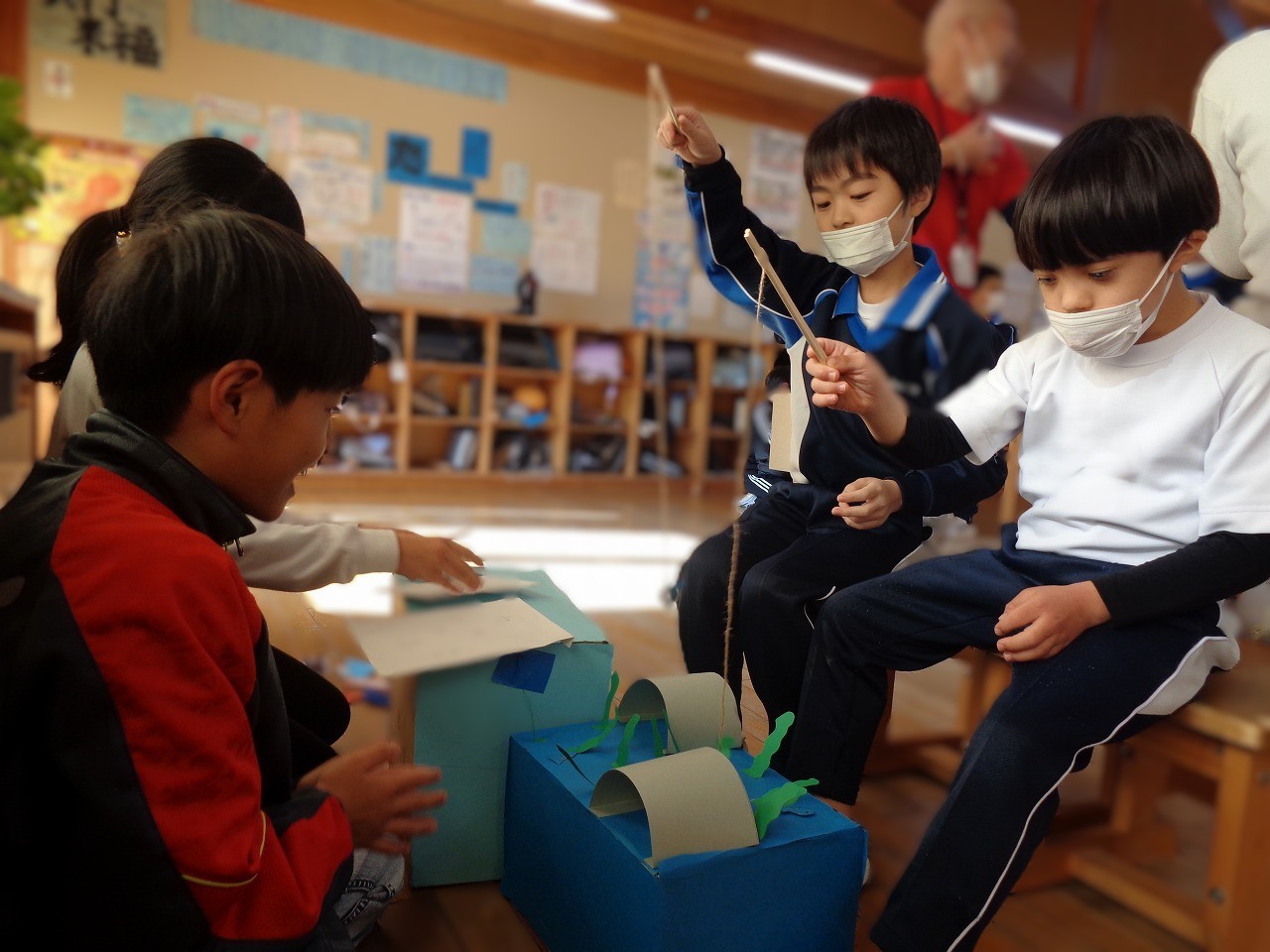 谷汲小学校の児童が当校の児童と一緒に活動できるように、約1か月掛けて考え、制作した「もぐらたたき」「ボウリング」「魚釣り」「ガチャガチャ」を楽しみました。「じょうず!!」「がんばれ!」「ゆっくりでいいよ」等、谷汲小学校の児童が温かい言葉をたくさん掛けてくれて、笑顔で交流することができました。
