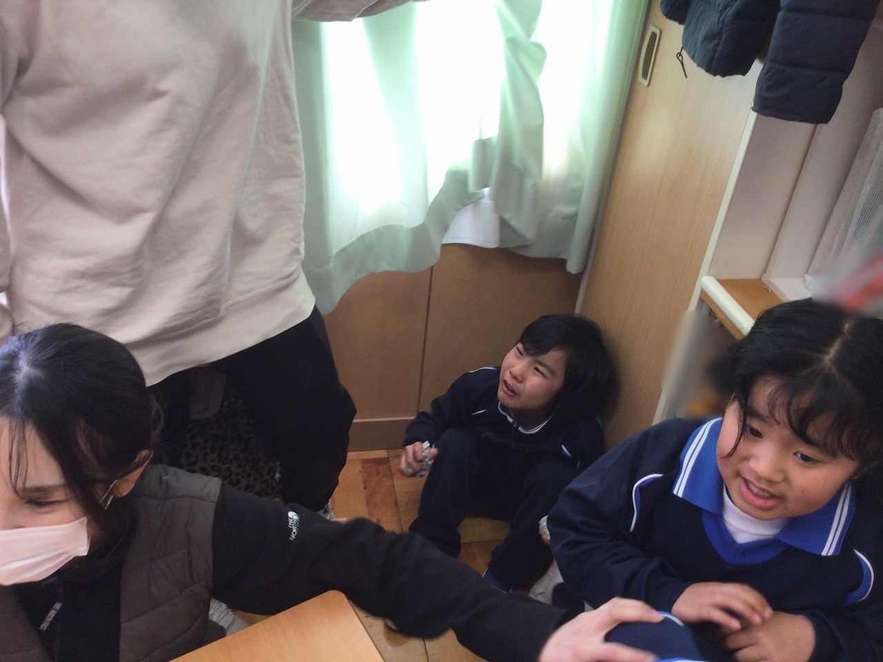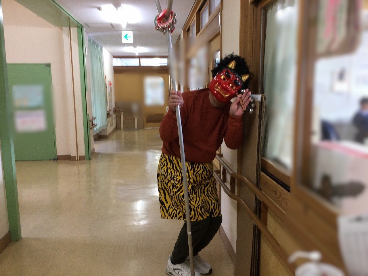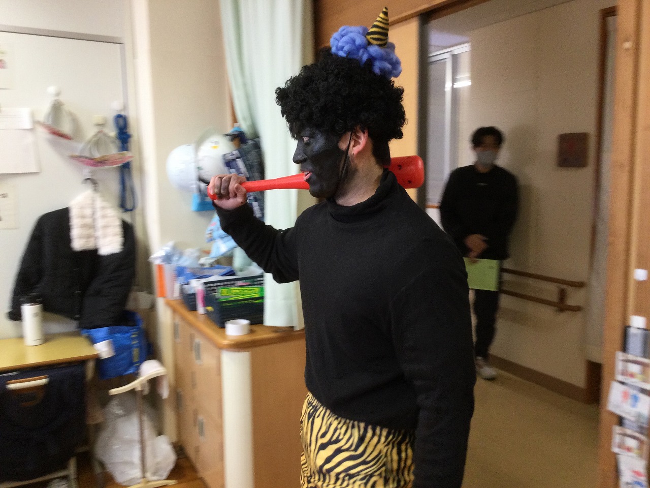 2月3日の節分の日に、こわーい鬼がやってきました。驚いて怖がる児童がいる一方で嬉しそうな表情を見せる児童、全力で豆をまいて退治しようとする児童等様々な姿が見られました。みんなで協力して豆をまくことで、鬼たちは山へ帰って行きました。