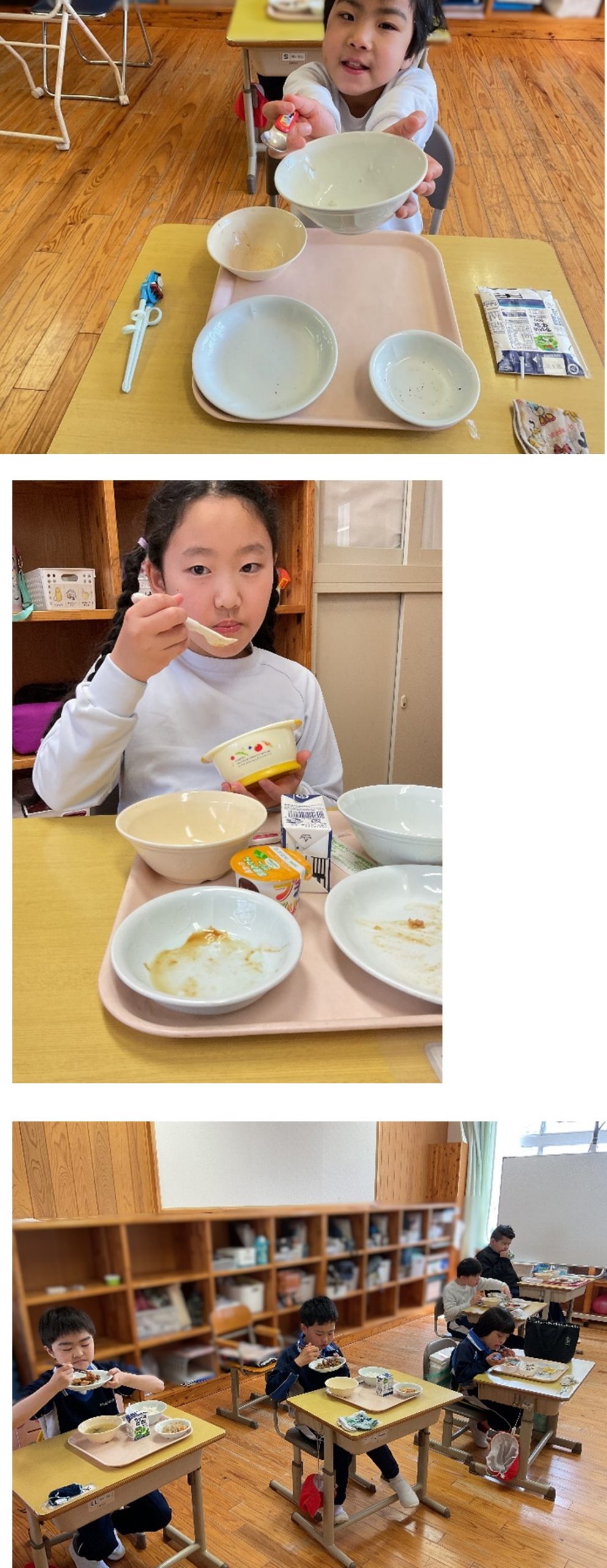 おいしい給食に喜びの声が出たり、「これ、おいしいね」と言いあったり、苦手なものを励ましあって食べたりしています。