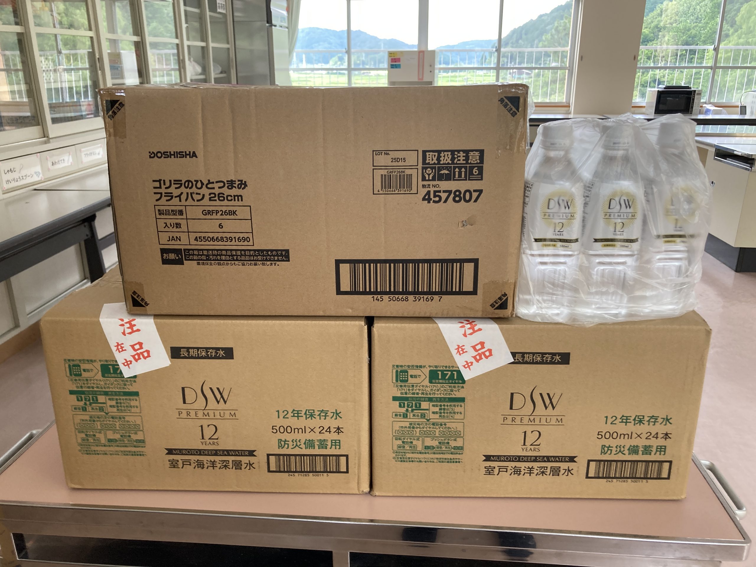 イオンビッグエクストラ岐阜池田店で毎月11日に発行される黄色いレシート。 投函していただいたレシートの合計金額の1%が当校に寄付されました。 そのご寄付で、防災備蓄品として保存水を購入しました。