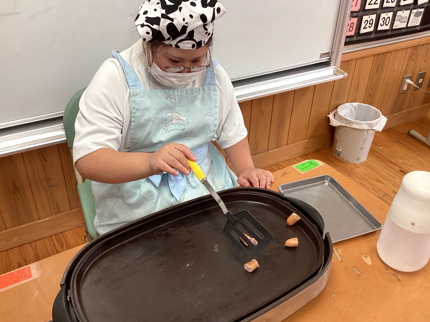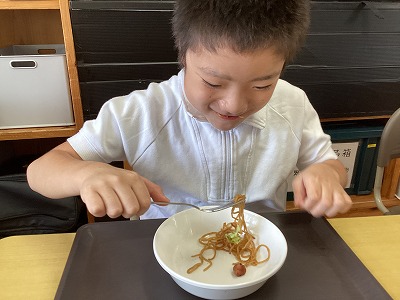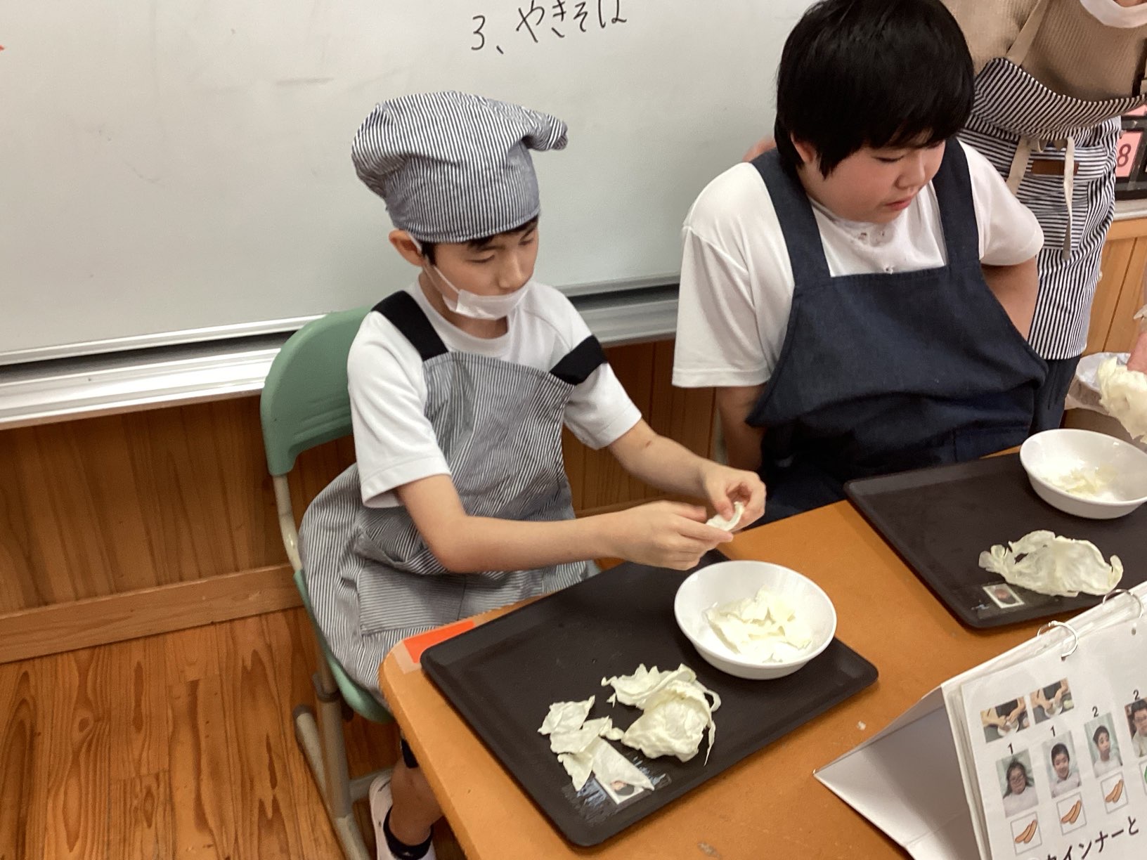 食育マイスターになろう! 投稿日時: 2025年9月17日 投稿者: ibi-sns 小学部6年生では、「家庭の食育マイスター」になるために、味噌汁、おにぎり、焼きそばを作りました。 味噌汁作りでは、好きな具材を選び計量カップを使って150mlのお湯を測って入れることができました。 おにぎり作りでは、おにぎりを握るだけでなく、率先してお米を洗って炊く準備をしました。 焼きそば作りでは、ソース、鶏がらスープ、白だしの中から味を選んでアレンジ焼きそばを作りました。 どの児童も自分で作った料理をおいしそうに食べていました。