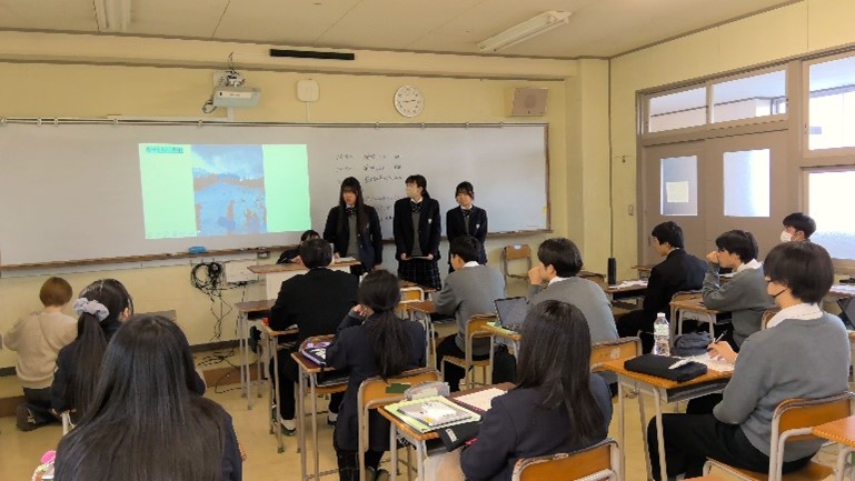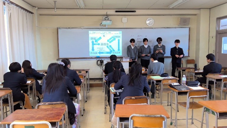 今年度の2年次生は、「コースの学び×地域課題」を大テーマにそれぞれの学習テーマを定めて探究活動を行いました。1年間、課題解決に向けてのアイディアを出し合いし、検証活動を行ってきました。最終的にプレゼン資料を作成し、スクリーンに投影しながら報告を行いました。