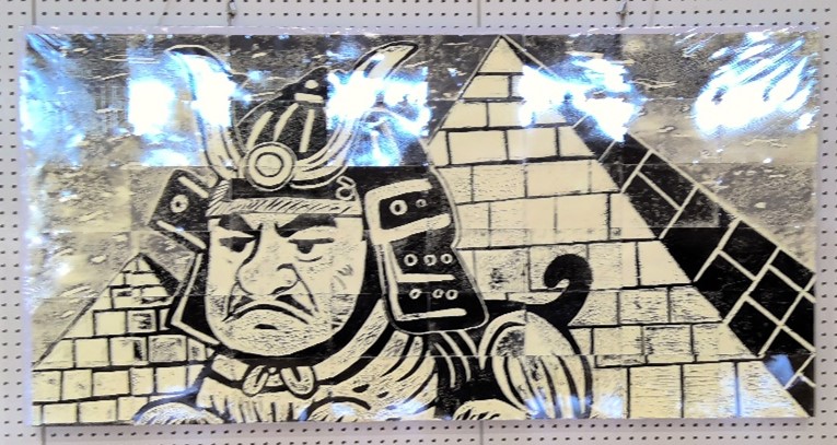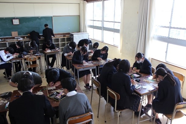 本年度、41回を数える版画大会が「世界遺産~版画で世界進出~」をテーマとし、実施されました。クラス毎に大会テーマに基づき、特色ある作品を制作しました。3月9日に版木彫り・刷りを行い、11日には各クラスの8つの作品が、体育館に展示され、全校鑑賞を実施しました。