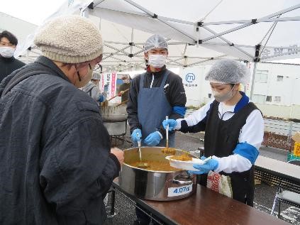 翌14日の炊き出し訓練当日は、テント10張りの設営や食事スペースなども含めた机・椅子の準備、炊き出しのカレー作りや配膳、ゴミ処理などを地域の方々と共に担当しました。生徒たちは自ら役割を見つけ、声を掛け合いながら主体的に行動し、会場運営を支える大きな力となりました。また、活動の中で地域の方々から「ありがとう」という言葉を直接かけていただく場面も多く、言葉のもつ大きな力を改めて理解する機会となりました。災害は起こらないことが一番ですが、万が一の際には「自助・共助・公助」が重要です。今回の活動を通して、高校生であっても地域を支える一員として大きな役割を果たせることを実感しました。そして、私たちが住む地域の中で、「みんなが力を合わせて支え合えるまちづくり」に向けて、高校生としてできることを考え、行動していきたいと思います。