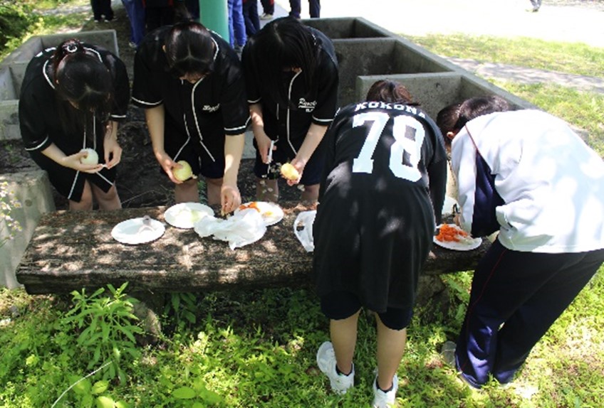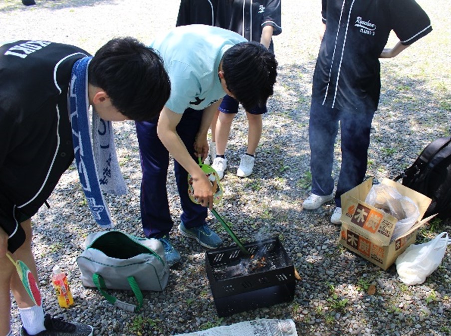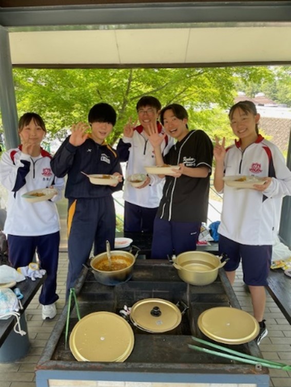 5月13日(火)に大津谷公園キャンプ場で、仲間作りと防災訓練を目的としたカレー作りを行いました。事前に各グループで役割分担や調理方法の確認を行い、当日に臨みました。火起こしやハイゼックスを用いての炊飯、包丁を使わない調理はほとんどの生徒が初めてで、なかなかうまくいかない様子も見られましたが、グループで声を掛け合い、助け合いながら自分たちの力でカレーライスを作りました。野菜に火が通っておらず硬いままの野菜、芯のあるご飯、味の薄いカレーが出来上がったりと失敗もしましたが、今後の学校生活や日常生活の中で失敗を恐れずに前に出ていける生徒になってほしいと思います。