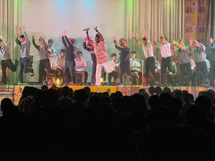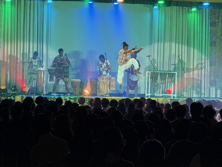 セネガル人のミュージシャンによる演奏を聞き、体験コーナーでは生徒がステージ上で楽器を演奏したり、ダンスをしたりと楽しく文化に触れることができました。