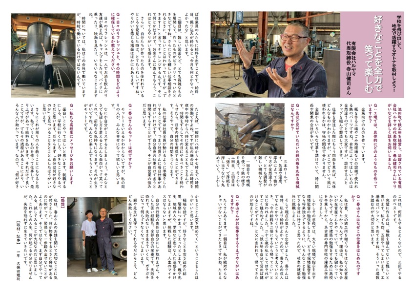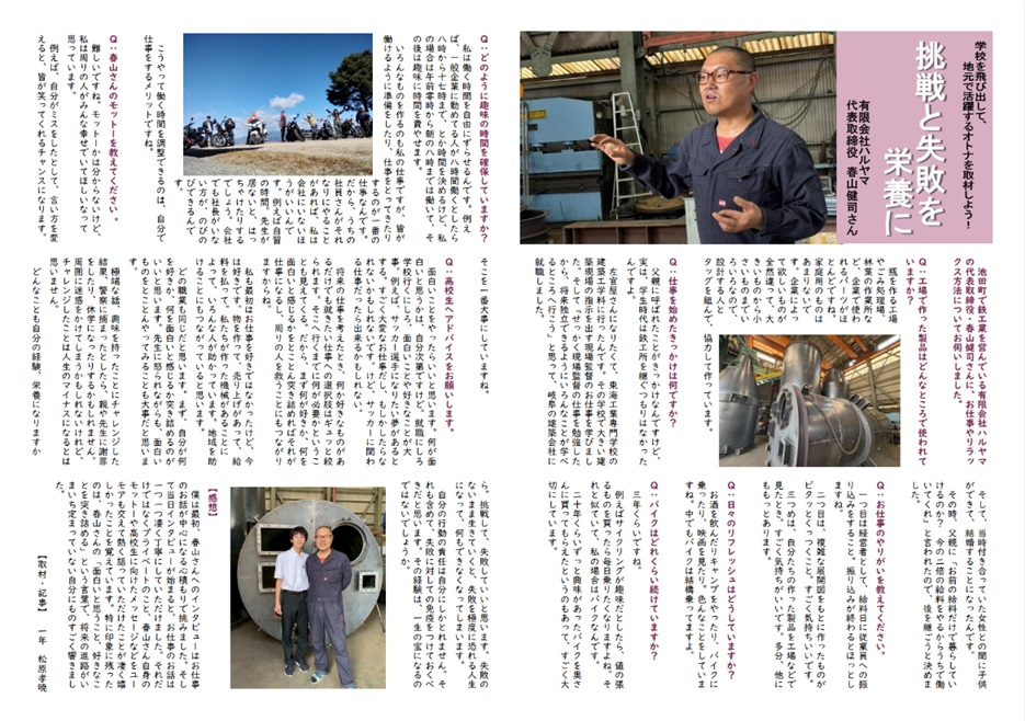1年生の有志4名が、地元で活躍するオトナ(有限会社ハルヤマの春山さん、池田町長の竹中さん、カフェシフォンの佐村さん)に、ご自身の仕事に対する想い、将来の展望や私たち高校生へのメッセージを取材し、記事にまとめました。初めて経験する取材や記事作成を行うために、名刺の渡し方や読みやすい記事の書き方、目を引く写真の撮り方など、ライターの方やフォトグラファーの方などのサポートをいただき、準備に取り組みました。インタビューをさせていただく前は緊張を隠せない様子でしたが、それぞれの方の温かいお人柄に安心し、練習を活かし臨むことができました。