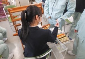 臨床検査技師の仕事着である白衣とスクラブを着用し、超音波(エコー)や顕微鏡、聴診器などの実習器具を使って、仕事を体験させていただきました。また、この仕事はチーム医療の中で医師の仕事を支える重要な役割を果たしていることも教えていただきました。今回の講義で臨床検査技師の仕事について初めて知った生徒も多く、知見を広める良い機会となりました。