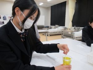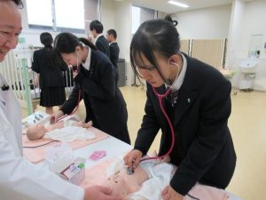 その後、2つのグループに分かれて、それぞれ丁寧に指導していただきながら看護実習をさせてもらいました。実際に体験させていただく中で、生徒たちはこれから立派な看護師になるために学ぶべき様々なことを、よりイメージできるようになりました。