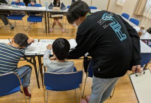 本校生徒が各務原市教育委員会主催の「ららら学習室“ステップ”」にボランティアスタッフとして参加しました。ららら学習室は、塾に通っていない小学生を対象に、自学自習の場が提供されているというもので、それに参加している子どもたちの質問に答えたり、一緒に考えたりするサポーターとして、生徒が参加しました。答えを教えるのではなく、一緒に考えることや、答えまでの考え方をサポートすることを意識して取り組むことができていました。
