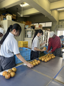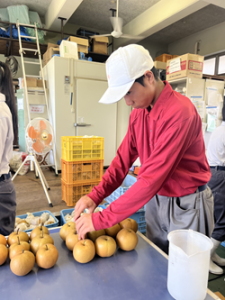 収穫したナシをサイズごとに分け、丁寧に袋詰めを行います。