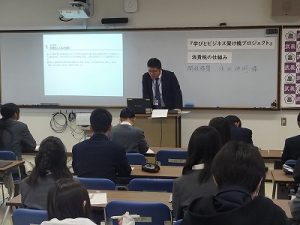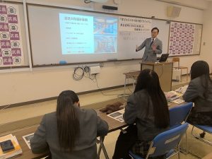 ビジネス情報科3年の3名が、『学びとビジネス架け橋プロジェクト』の一環として「ビジネス・コミュニケーション」で学んだ「商品説明とSNSを利用した情報発信・ビジネス」について、(株)小川屋 経営企画室長 大原純様に講義して頂きました。宿泊や日帰り温泉利用など、多くのお客様に選ばれる秘訣を詳細かつ具体的に学ぶことができ、大変有意義なひと時となりました。