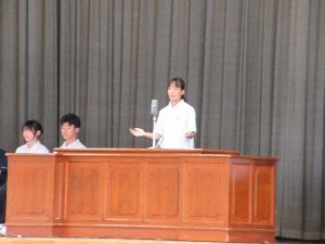 10月9日(木)、1年生英語の一環としてレシテーションコンテストを開催しました。審査員に岐阜大学の巽 徹教授をお迎えし、クラス予選会で選ばれた17名の生徒が発表しました。暗唱はもちろんのこと、表情豊かに身振りなども交えての発表は圧巻でした。