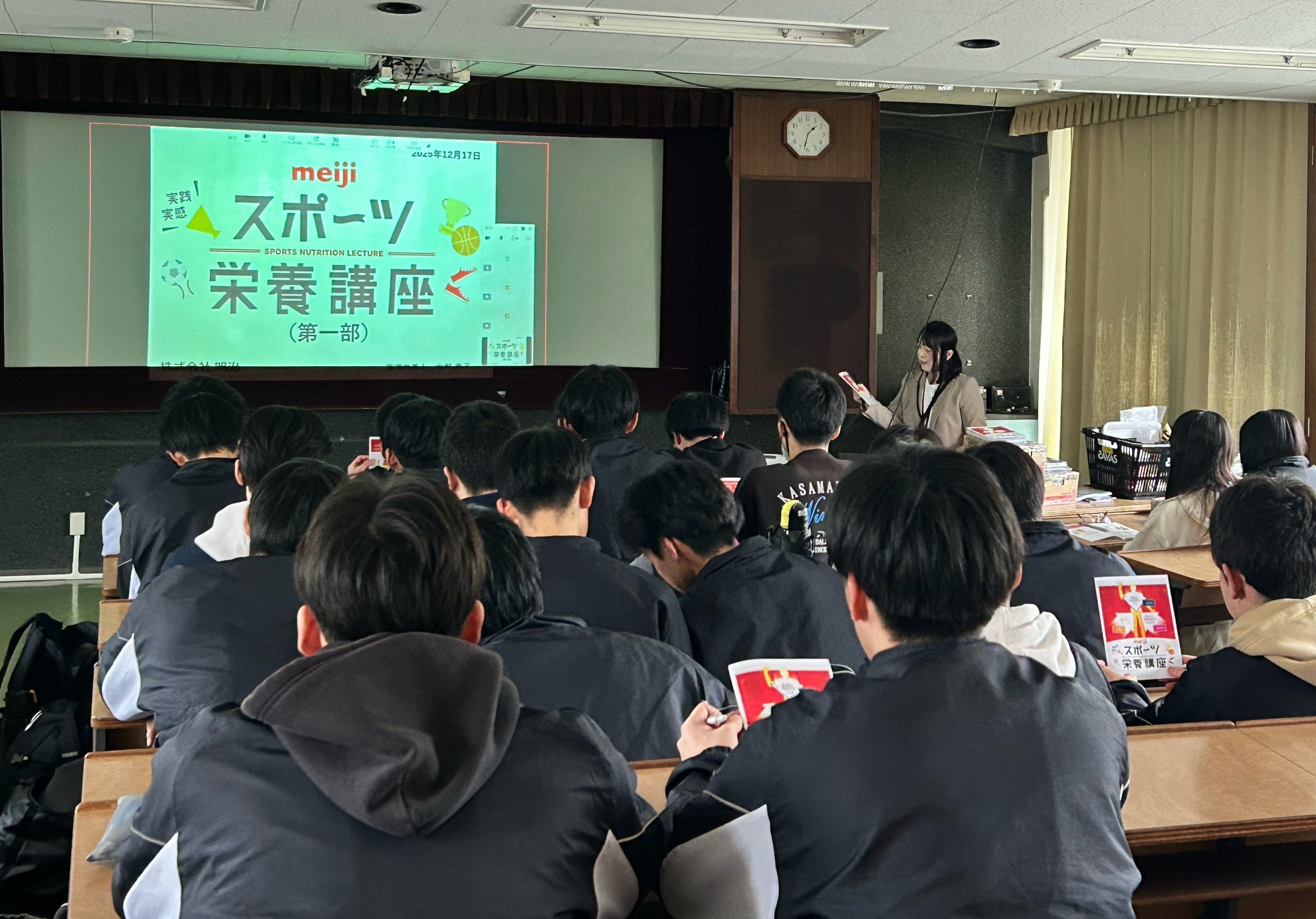 12月17日に希望する部活動を対象に株式会社 明治さんによるスポーツ栄養講座を開きました。食事は体づくりのための土台であること、スポーツ選手の基本食は「栄養フルコース型」の食事であること、スポーツ選手の体づくりに重要な栄養素はタンパク質であることを学び、貴重な機会となりました。