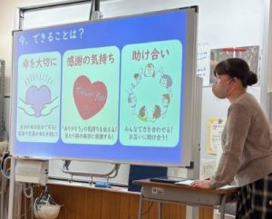 講話では、講師のお二人が実際に被災地で支援をされた様子を伺い、自助(自分の命は自分で守る)、共助(お互い助け合う助ける人になる)、公助(自分にできることはないかを考える)、「今自分にできることは何か」等を教えていただきました。「当たり前の日々を過ごすことへの感謝」を痛感し、今後の人生において大きく響く体験となりました。
