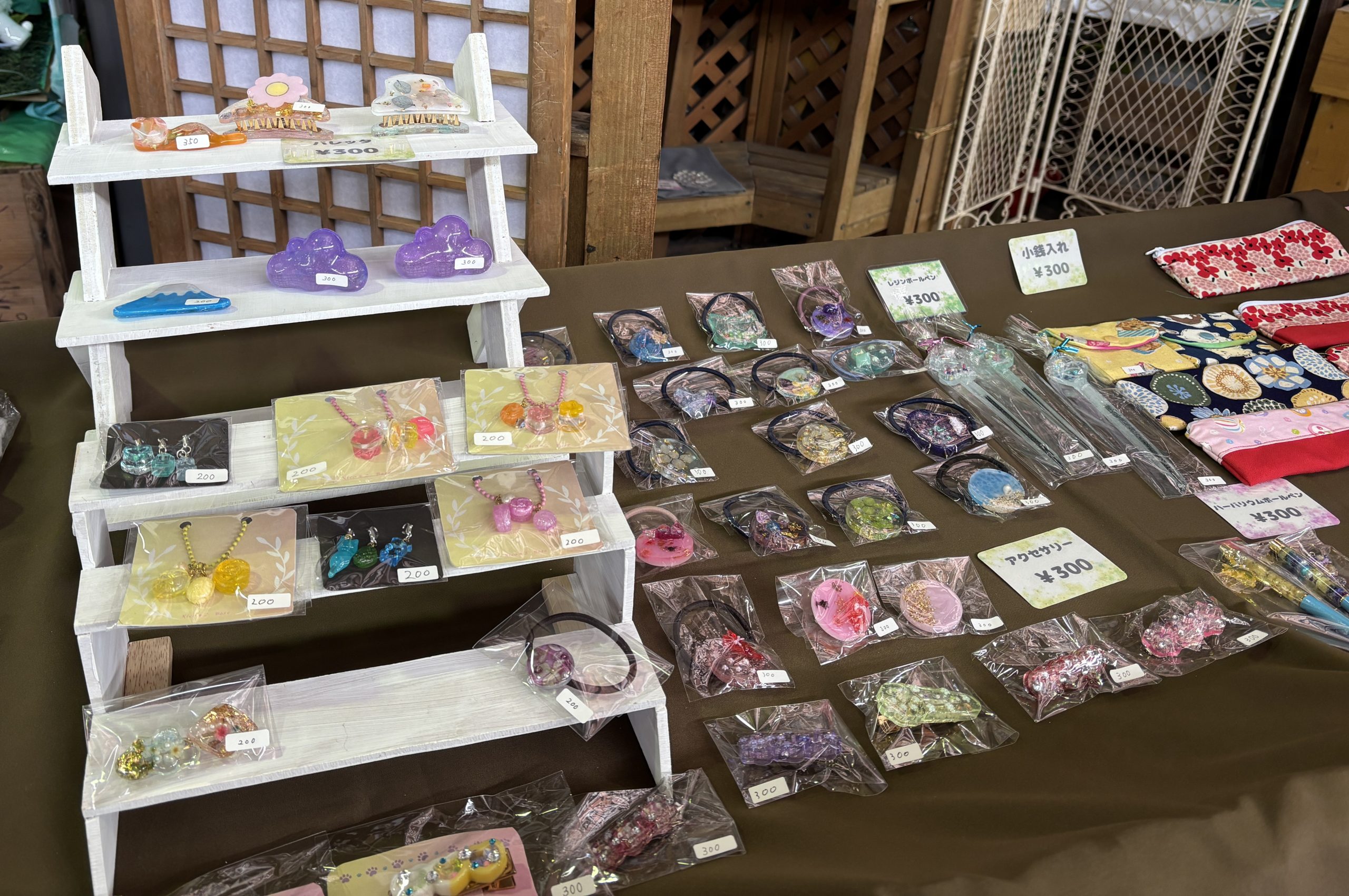 また、地元の「長良園芸」様で開催したドリームアート展において、期間中の13日(金)と15日(日)に、高等部作業製品販売会が行われました。生徒が心を込めて製作したレジン製品や布製品が並び、来場された学校関係者や地域の方々から大変ご好評をいただきました。