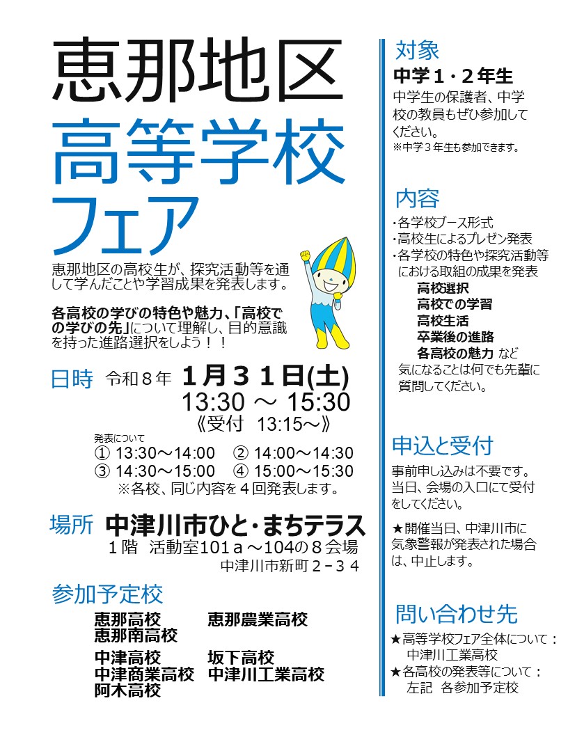 恵那地区高等学校フェア 投稿日時: 2026-01-20 投稿者: nakatgawa-ths 中学1・2年生とその保護者の方を対象に「恵那地区高等学校フェア」を開催します。 恵那地区公立高校8校がブースを設け、生徒による学習成果の発表や高校生活・学校の魅力などを一度に知ることができます。 日時は令和8年1月31日(土)13:30~15:30、場所は中津川市ひと・まちテラス1階で、事前の申し込みは不要です。ぜひご来場ください。
