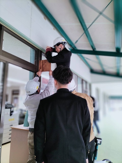 作業は、本校 3年建築土木工学科の生徒4名が担当し、いただいたデザインをもとに制作、取り付けまでを丁寧に取り組みました。