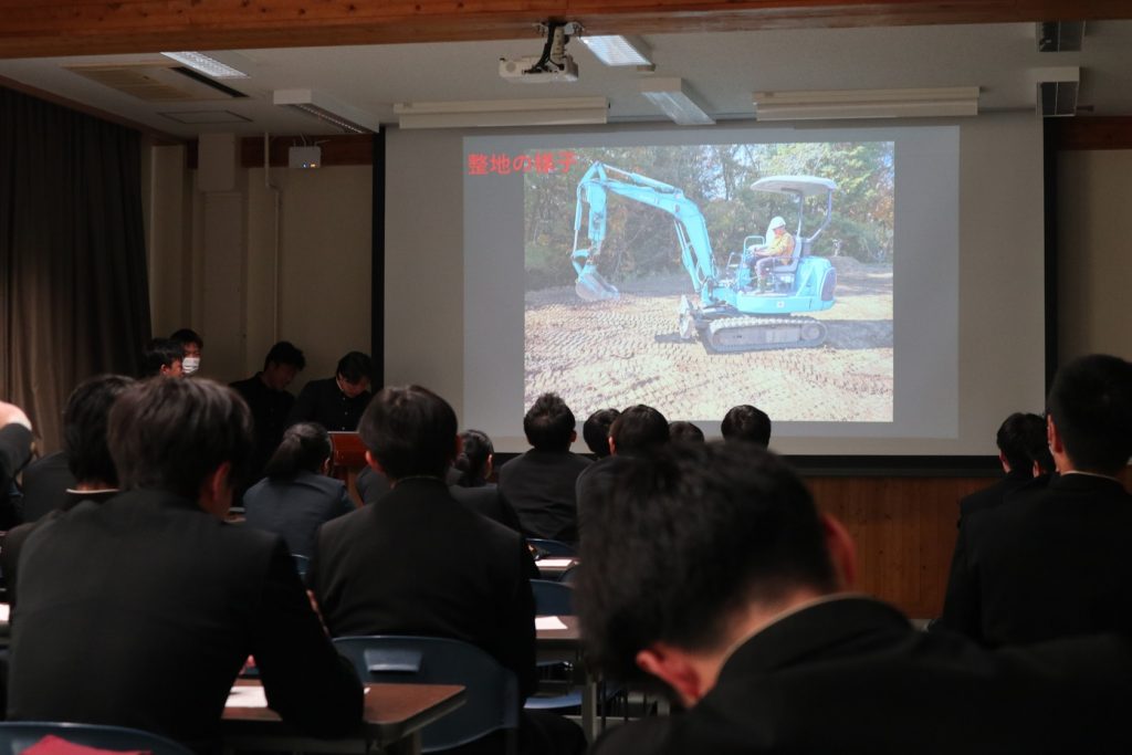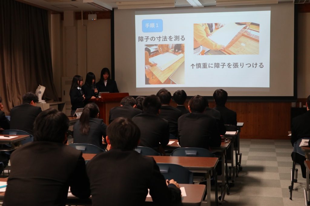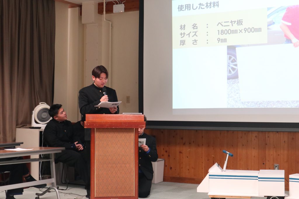 1月末から2月の初めにかけて、本校では学科ごとに課題研究発表会を行います。この発表会は、3年生の「課題研究」という授業で1年間作り上げてきた成果を2年生や校内職員を対象に発表するものです。「課題研究」では、3年生がいくつかのグループに分かれて1からものを作り上げます。
