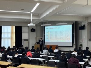 本校では、今年度から朝日大学と連携し、来年度からの課題研究に向けて、2年生マーケティング類型の生徒たちが経営学部教授 中畑千弘先生の授業を大学生とともに受講しました。昼には学食体験や施設見学も行い、実際の大学の雰囲気を味わうことができました。