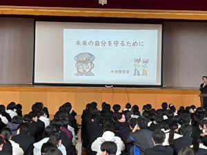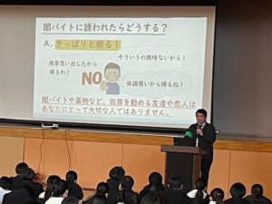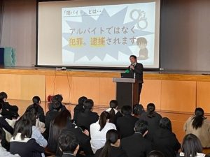1、3年生の生徒を対象に大垣警察署生活安全課の方を講師に、闇バイトとはどんなものなのか、その危険性について話していただきました。犯罪防止意識を高めるため、SNSやインターネットの掲示板などで、仕事の内容を明らかにせず「短時間で高収入が得られる」など甘い言葉に勧誘される危険性や、犯罪に加担しないための注意点について情報モラルの内容と関連づけながら説明をしていただいた。