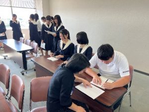 さらに、隣同士で正しいお辞儀の方法を実践したり、電話応対の練習をしたりするなど、実際の場面を想定したロールプレイングを交えながら、指導をしていただきました。今後、進学・就職どちらを選んだとしても、入学試験や採用試験の場、その先の社会人生活で必ず役立つ知識になったはずです。ぜひ、「さすが大商生!」と言っていただけるような立派な姿を目指してほしいです。