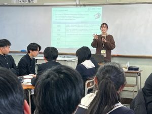 本校では、今年度から朝日大学と連携し、来年度からの課題研究に向けて、2年生マーケティング類型の生徒たちが経営学部教授 中畑千弘先生の授業を大学生とともに受講しました。昼には学食体験や施設見学も行い、実際の大学の雰囲気を味わうことができました。