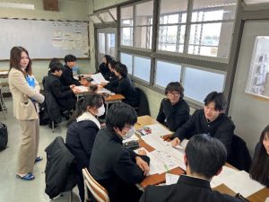 2月2日(月)5・6限目、昨年12月に引き続いて朝日大学から中畑千弘先生と12人の大学生の皆さんにご来校いただき、来年度の課題研究での取組に向け、2年生AB組マーケティング類型の生徒たちが販売促進の際のSNS活用法について学びました。