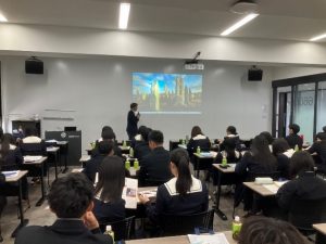 はじめに、日常生活の中でよくある「間違った言葉遣い」や「マナー」などを教えていただき、社会人としての心構えや責任について、お話ししていただきました。また、敬語や身だしなみなどの基本的なマナーについてもご説明してくださり、生徒たちは熱心にメモを取りながら聞いていました。
