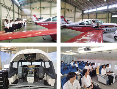 セミナーでは、航空宇宙産業の現状を学習し、中日本航空専門学校の各学科の施設見学を行いました。その中で、航空機の操縦体験、フライトシミュレータ見学、航空機の機内座席体験、グランドハンドリング見学など、貴重な設備を見学・体験させていただきました。