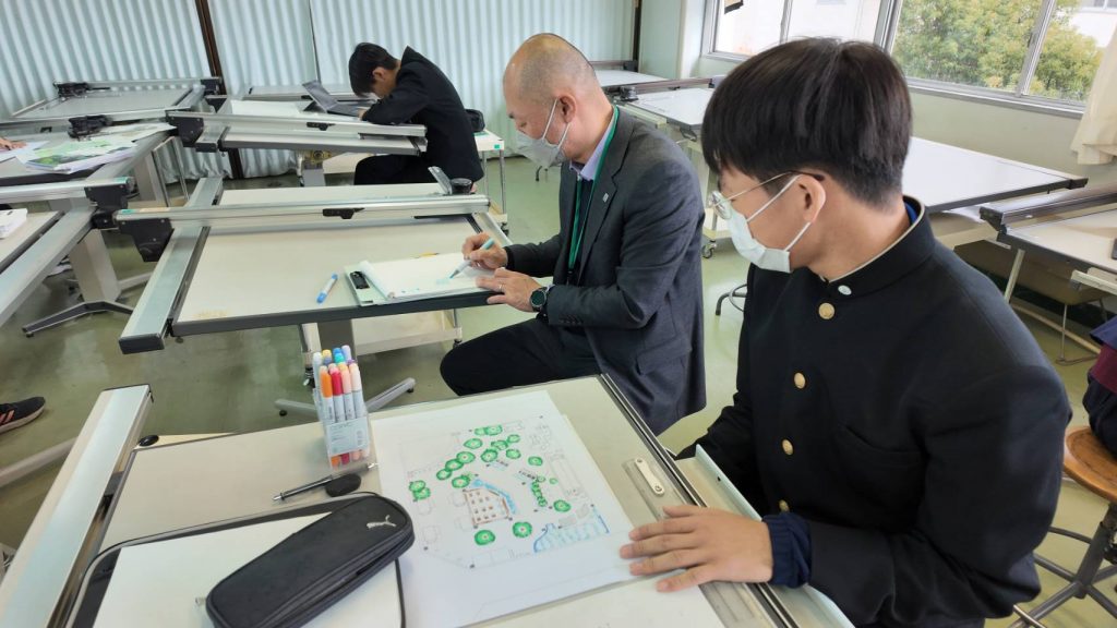投稿日: 2025年12月8日 投稿者: ogaki-ths建設工学科群_ランドスケープデザイン 技術指導 土木工学科・土木実習「ランドスケープデザイン」では、9月から複数回にわたり、昭和造園土木株式会社様にご協力いただき、公園の設計・デザインに関する技術指導を受けています。設計技術者による実践的なアドバイスを通じて、生徒はプロの視点から設計プロセスを学び、本格的な公園デザインに挑戦しています。パース作成や図面制作などの専門的なスキルを身につけることで、表現力や計画力が大きく向上し、将来の実務に直結する力を養っています。