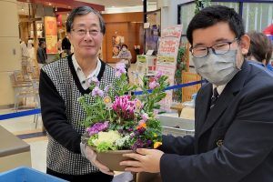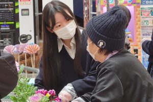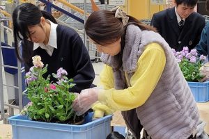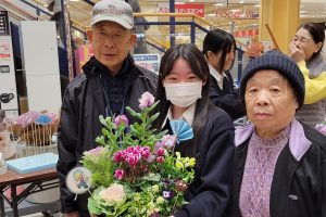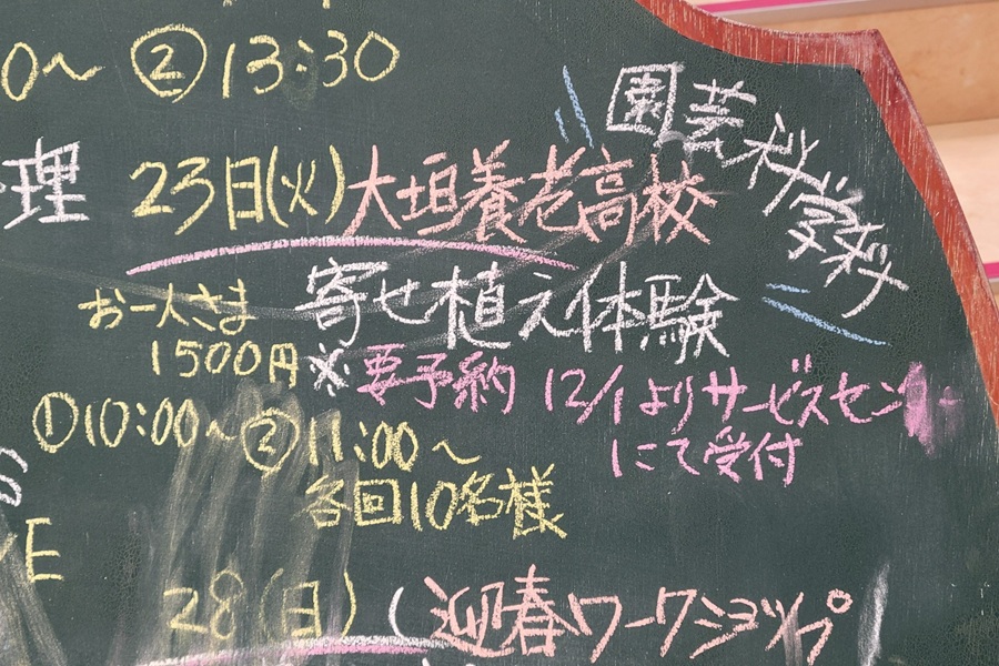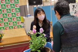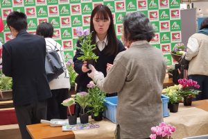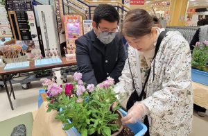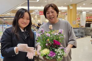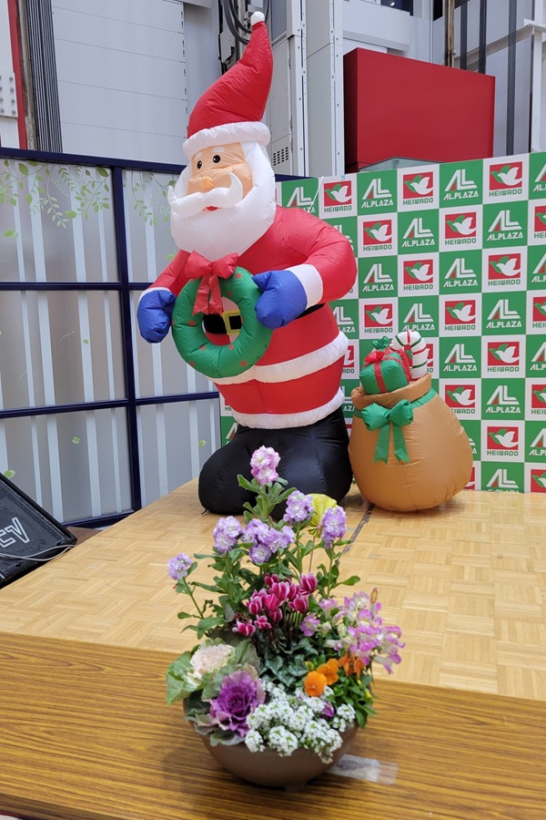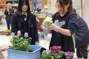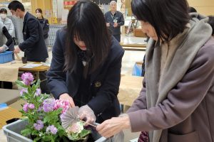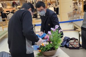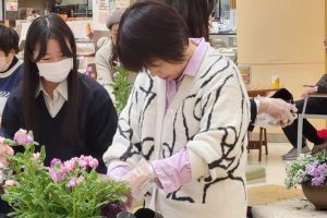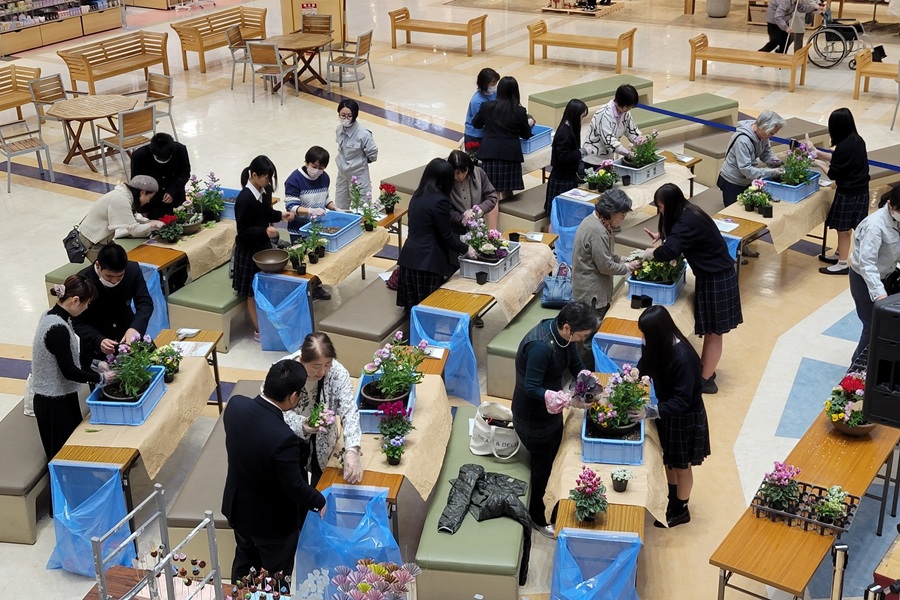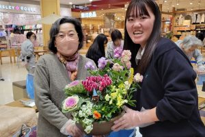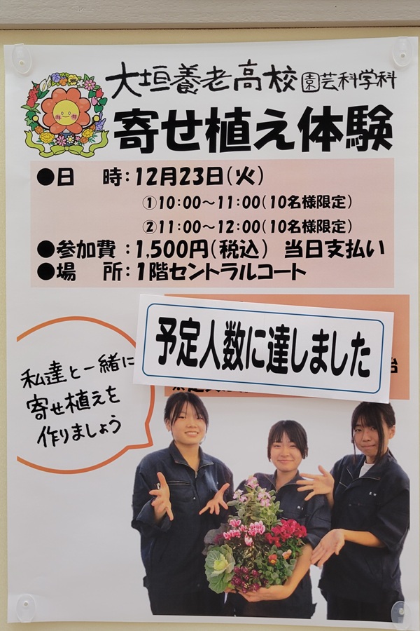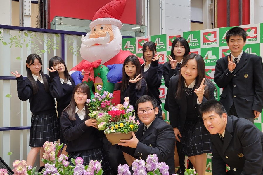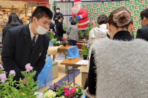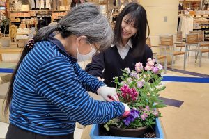 12月23日(火)平和堂鶴見店の1階セントラルコートで開催された当店主催のクリスマスイベント「寄せ植え体験」に、園芸科学科2年草花専攻生10名が参加しました。事前に参加申し込みをされた20名の方を対象に2回に分けて、本校生徒が講師役としてオリジナルの寄せ植えを参加者と一緒に製作しました。参加された方も、思い思いの作品に仕上がり満足されていました。