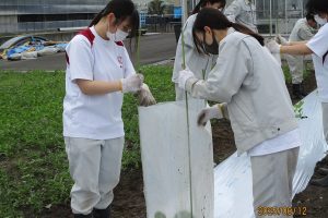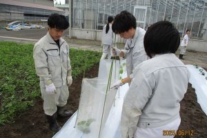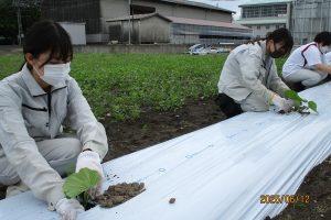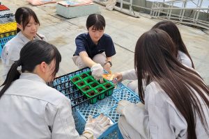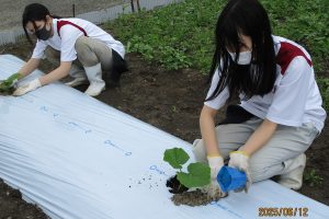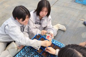 | 5月22日(木)アクア・トトぎふの水族館スタッフと初顔合わせを行い、その後3種類のカボチャのタネを播種しました。 | 6月12日(木)「総合実習」の時間に、カボチャ苗を定植しました。 | |