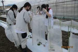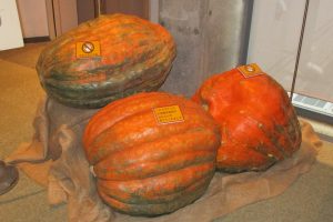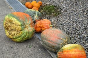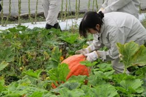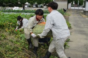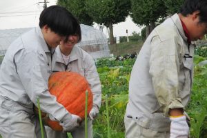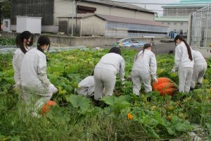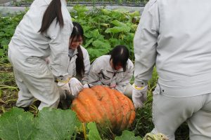 | 定植したカボチャ苗が痛まないように、ビニールで保護しました。 | 10月7日(火)「課題研究」で収穫をしました。大きいもので直径60cmほどに育ちました。 | |