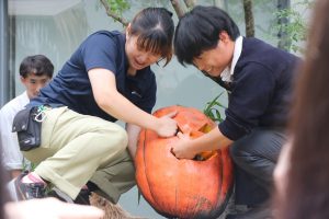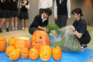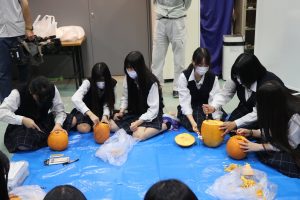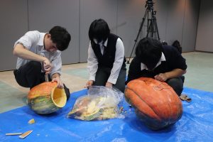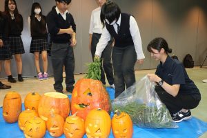 | 会場に到着後、持ち込んだ10個ほどのカボチャに、包丁や彫刻刀などで中身をくり抜き、目や鼻を彫ってジャックオーランタン風に加工しました。 | ||