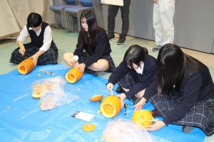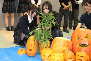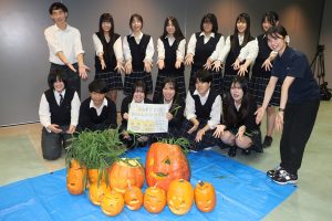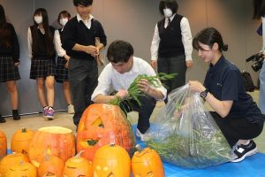 10月15日(水)園芸科学科3年野菜専攻生15名(当日欠席2名)は、各務原市にある世界淡水魚水族館「アクア・トトぎふ」に出向き、5月から授業「総合実習」等で栽培してきたハロウィン用カボチャ3種類を持ち込みました。現地で持ち込んだカボチャの中身をくり抜いてジャックランタン風に加工し、カボチャの中には、カピバラのごはんである牧草をたっぷりと詰め込みました。代表生徒2名の男子生徒が飼育スタッフと共にカピバラの飼育スペース内に入り、カボチャをプレゼントしてきました。
