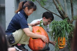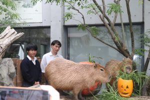 | 代表生徒男子2名が、飼育スタッフと共にカピバラの飼育スペース内に入り、手作りのカボチャをプレゼントしました。カピバラも美味しそうに食べてくれました。館内には、本校で育てたジャンボカボチャも展示されていました。 | ||