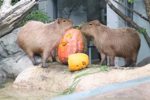 | 10月15日(水)世界淡水魚水族館「アクア・トトぎふ」のハロウィンイベント「カピバラにカボチャプレゼント」に栽培したカボチャを持参して参加しました。 | ||