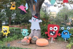 | 加工したカボチャの中に、カピバラの餌である牧草を詰め込み、授業で作製したポップと共に記念写真を撮影しました。 | ||