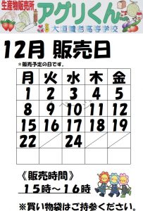 2025年12月17日 / 最終更新日時 : 2025年12月18日 大垣養老高校 アグリくん営業日 【アグリくん】12月販売日のお知らせ 『アグリくん』では、生徒達が日頃の授業で生産した野菜や草花、加工食品などを販売しております。 皆様のご来店を心よりお待ちしております。