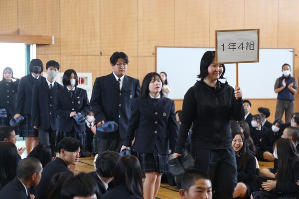 4月9日(水)5限体育館アリーナにおいて、生徒会主催の対面式が行われました。全学年が体育館に集合しての対面形式で開催されました。吹奏楽部の演奏の中、在校生の歓迎の拍手を受けながら、新入生が体育館アリーナに入場しました。その後、吹奏楽部による新入生歓迎の演奏に始まり、生徒会執行部の自己紹介、生徒会会長の歓迎の挨拶、新入生代表挨拶と進み、前日の入学式に続き、硬式野球部、女子バレーボール部等の部員による校歌披露、そして最後は生徒会による学校紹介のプレゼンテーションで幕を閉じました。