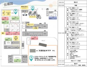 生徒の描いた絵を表紙に、各ブースの紹介、校内案内図、タイムスケジュールが載っています。