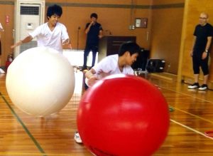 全校種目のひとつ『大玉送り』は、大玉を転がして三角コーンの間を進んだり、持ち上げて頭の上を運んだりしながらゴールを目指します。