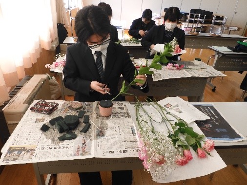 生活デザイン科3年生がフードデザインの授業で、フラワーアレンジメントに挑戦しました。授業テーマはテーブルコーディネートの花を活けてみようです。同じお花を使ったのですが、一人ひとり違ったアレンジメントを楽しむことができました。