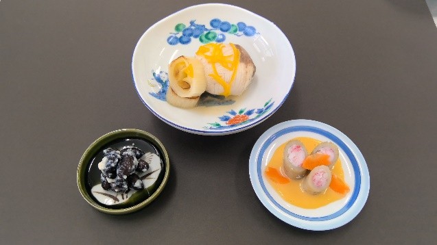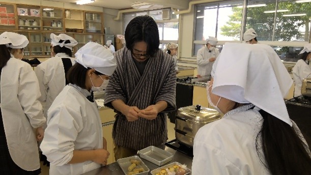 生活デザイン科2年生食物コースが日本料理講習会を受講しました。今年は管牛蒡の蟹射込みと黄身酢、鰤の味噌蒸し、黒豆の粕和えを教えていただきました。食材の扱い方・味の付け方や濃度など和食の基礎基本を教えていただき、技術面ではごぼうの芯をくり抜き、黄身酢の作り方のコツを学ぶなど、プロの技術を身近に学び専門性を高めることができました。また地域で活躍されている料理人の方に接し職業観を学ぶよい機会となりました。