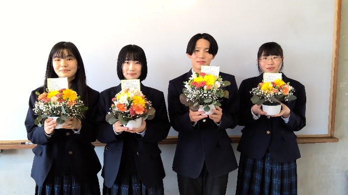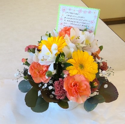 入学式を迎えた1年生のクラスに、家庭クラブから花をプレゼントしました。家庭クラブ役員がビタミンカラーのお花をアレンジし、「入学おめでとう」のメッセージカードをつけました。初めてフラワーアレンジメントをする役員もいましたが、かわいくアレンジできました。入学した生徒のみなさんが3年間、笑顔で生活できるように願いを込めました。