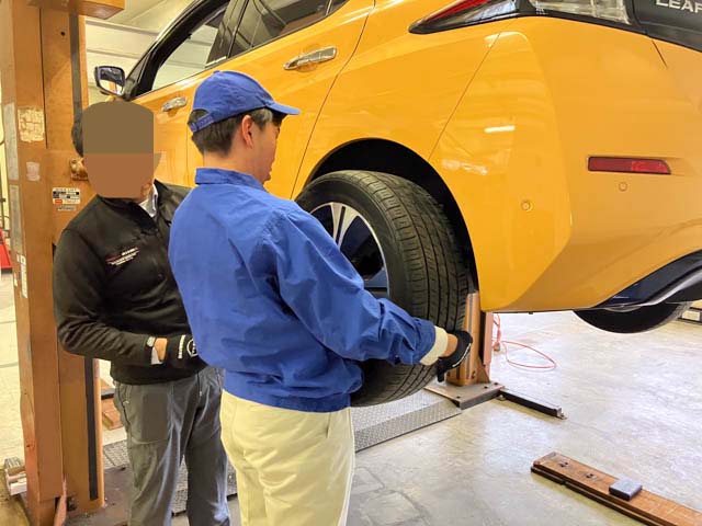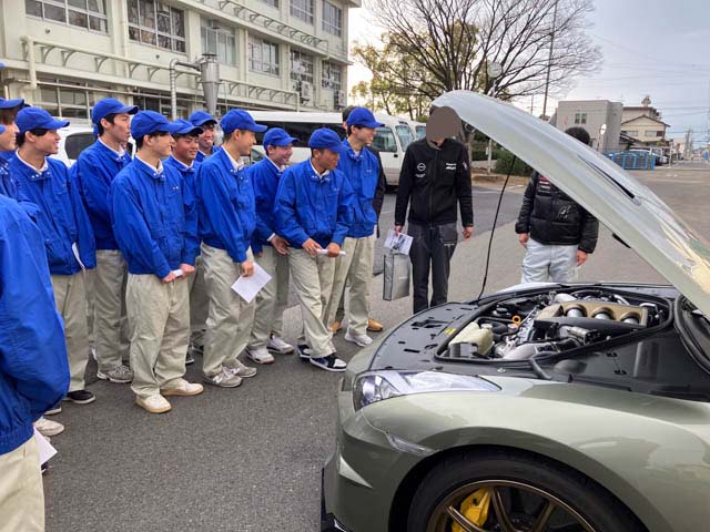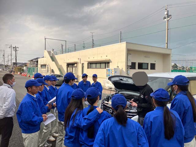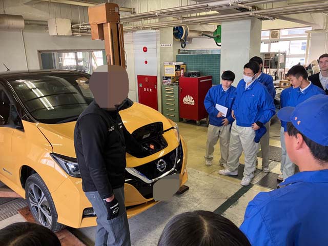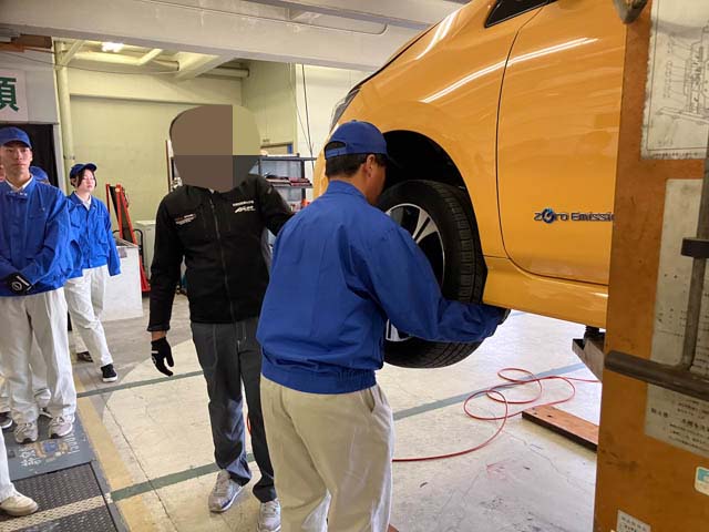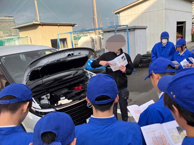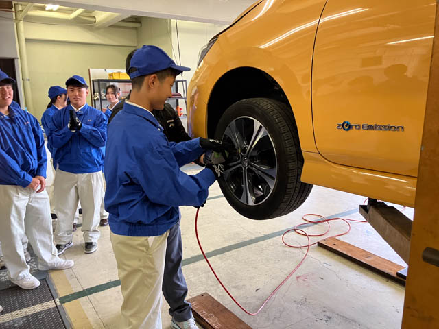 日産愛知自動車大学校より講師3名を招き、自動車の日常点検・タイヤ交換・自動運転システムについての体験学習を実施しました。