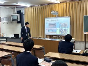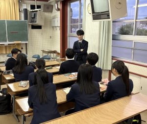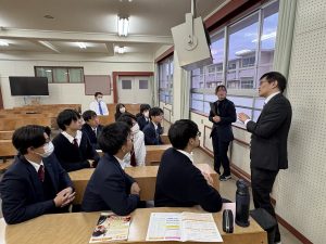また、事務局の方から、教員になる方法や教員の待遇等について説明していただきました。会の後半には座談会の時間が設けられ、参加生徒から積極的に質問が出されていました。教員になることを目指している生徒のみなさんにとって、大変、有意義な時間となりました。(会場での参加生徒18名、オンラインでの参加生徒10名)